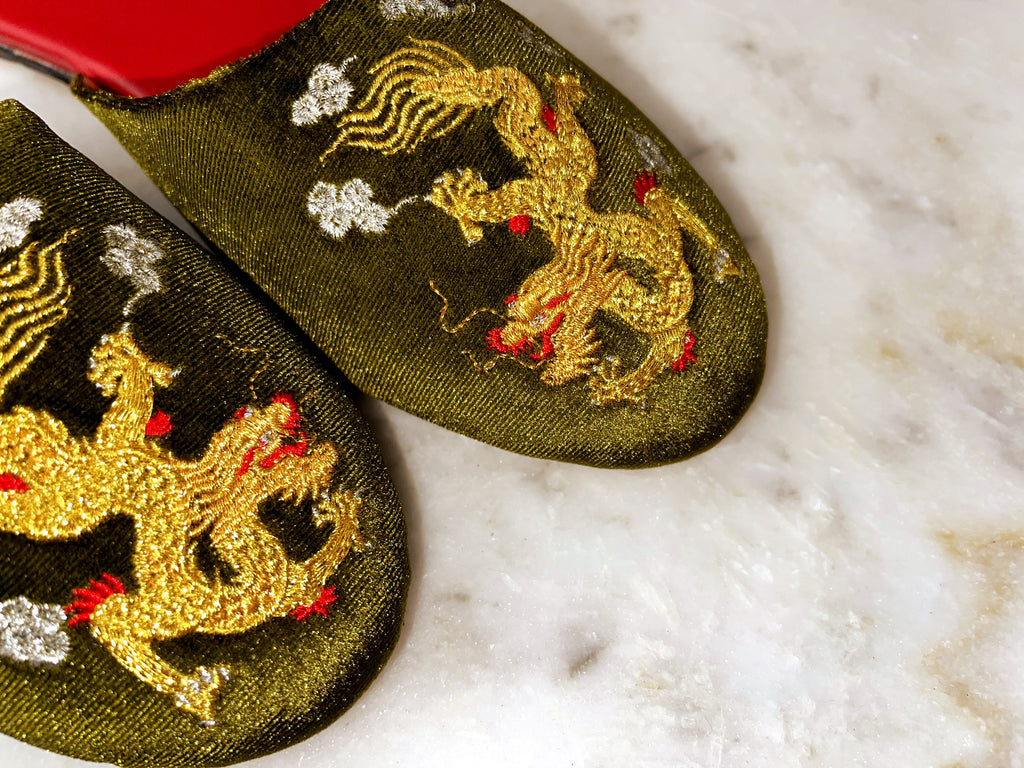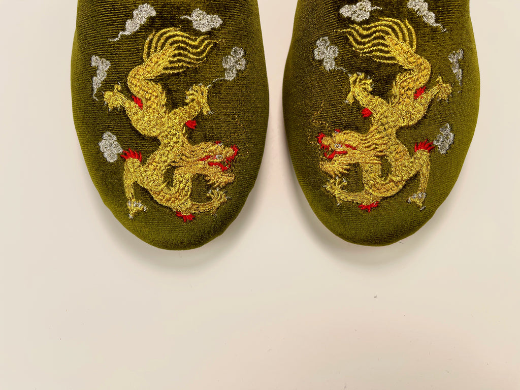 Golden dragon is always a symbolic design that represents the imperiality of the emperor. We used gold metallic thread in different shades of embroidery to show the delicate appearance. Almond toe with padded soles for adding comfort. They are handcrafted using butter-soft leather lining and insole. Outsole is leather in soft brushed handfeel. Narrow fit with low heel for extra elegance. You can pair with your favorite jeans for a stroll on Sunday farmer's market, or make yourself comfy with our mules for a perfect flight outfit and just as charming for a special night out.
