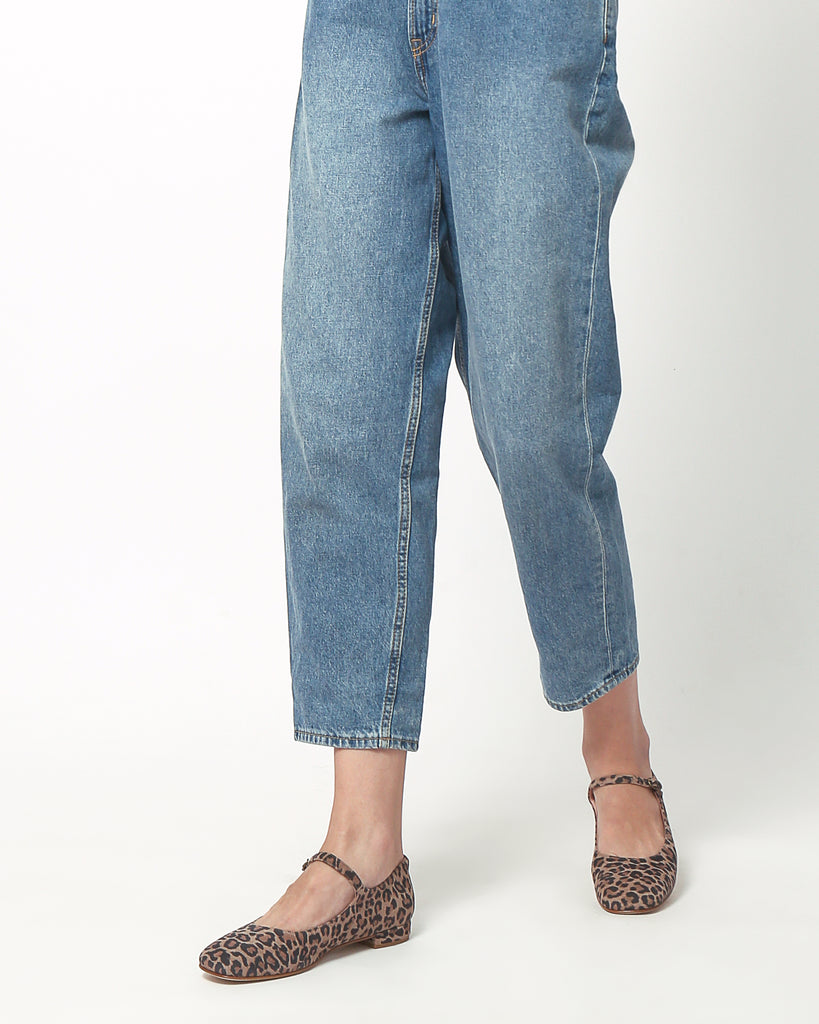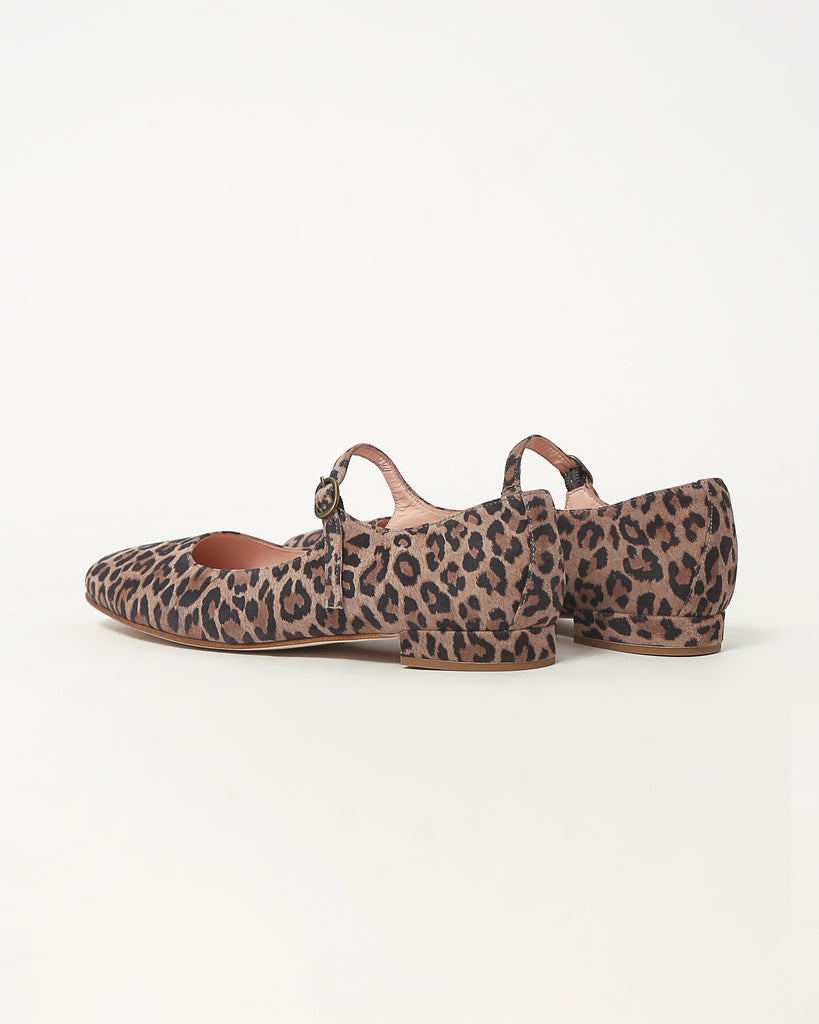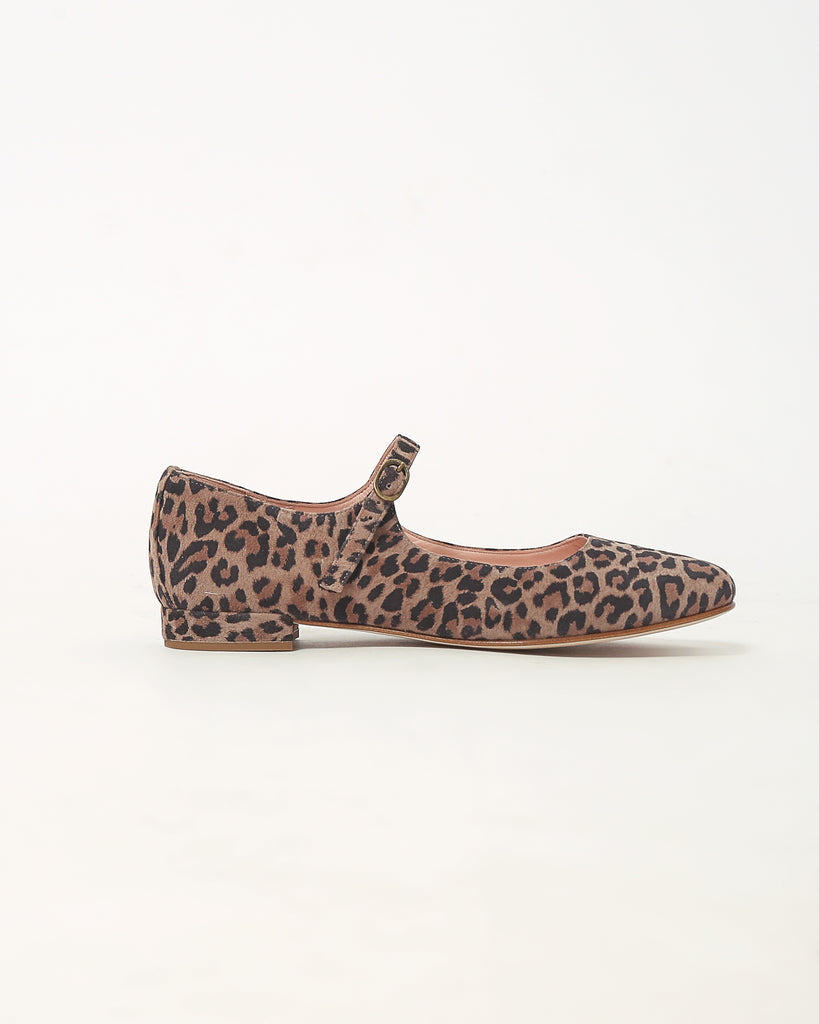 Our latest design in Los Angeles, Colette Mary Jane is handcrafted by the artisan from a small family owned Italian shoe factory. They are made with high quality suede leather in Leopard print. Single strap with antique brass buckle. Round toe and low profile 5/8" suede covered heels. Lightly padded footbed with our gold embossed logo.
